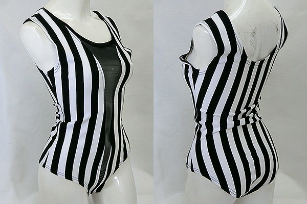 中古レオタード スポーツウェア類 2025.11.21 ■中古レオタード 【商品番号】CBE534 【価格】2,000円(税込:2,200円) 【メーカー】中国製 【サイズ】LL位 【素材】不明 丸首ノースリーブのレオタード 白黒の縦ストライプ柄デザイン。 胸元はメッシュ、クロッチ付き。 適度な使用感があります。