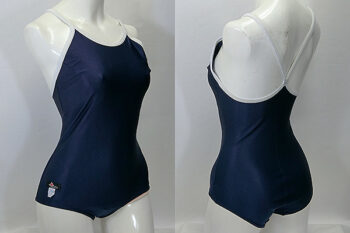白いパイピングタイプの紺色のスクール水着。
