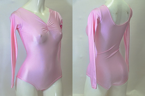 中古レオタード スポーツウェア類 2026.04.24 ■中古レオタード 【商品番号】CBE535 【価格】6,800円(税込:7,480円) 【メーカー】不明 【サイズ】L 【素材】不明 Vネックの長袖レオタード 光沢ピンク色の薄手生地を使用。 状態は良いです。